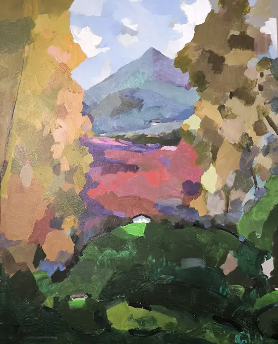 Udazkeneko hostoaldiak Larrun mendia urrunean ezartzen du